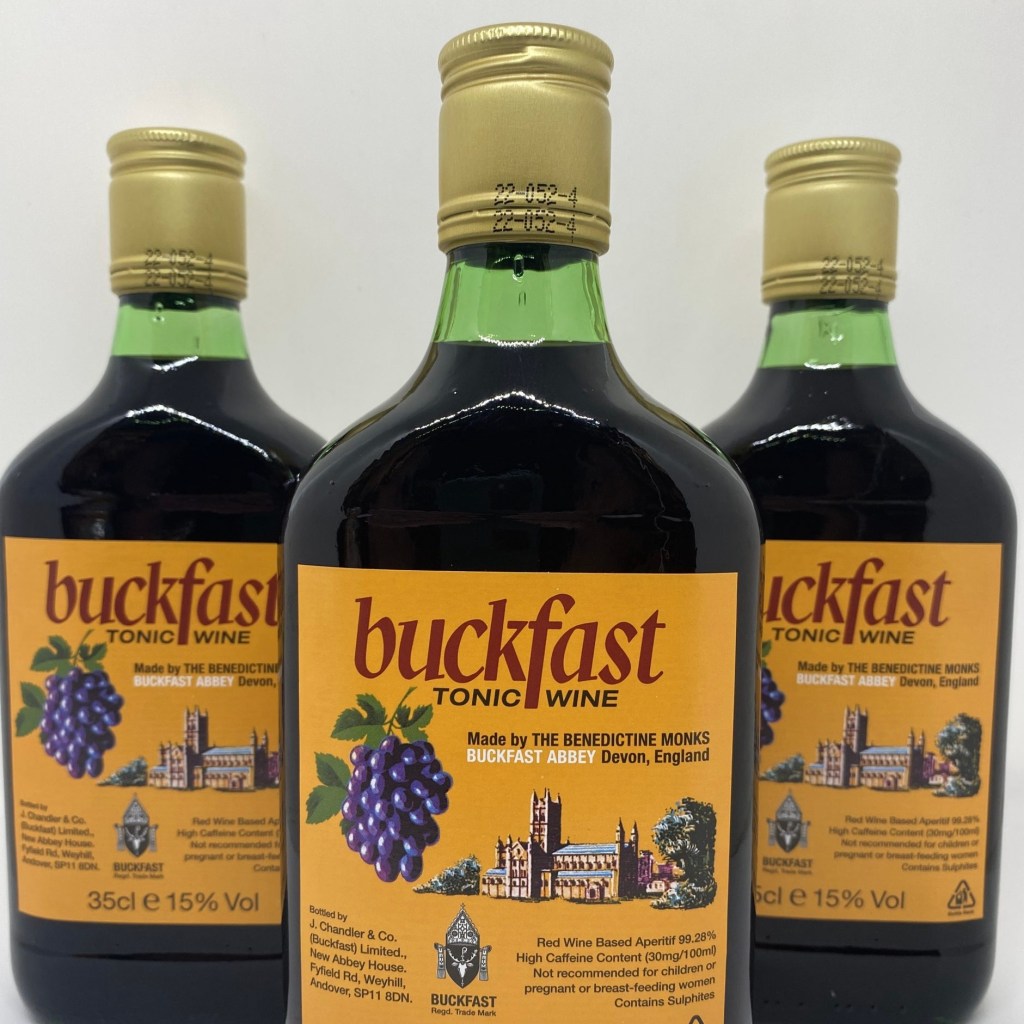 Buckfast makes me laugh so much. Branded as a tonic and produced by monks. The label is excellent though the colours work so well, the drawing of the abbey and those disproportionate grapes beside it. Fantastic.